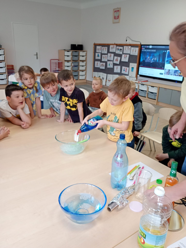 Dzieci były zafascynowane, pełne zachwytu i ciekawości. Dzięki eksperymentom rozwijały logiczne myślenie, spostrzegawczość, umiejętność obserwacji i odwagę w odkrywaniu świata.