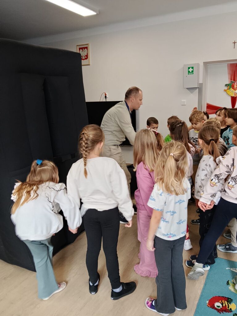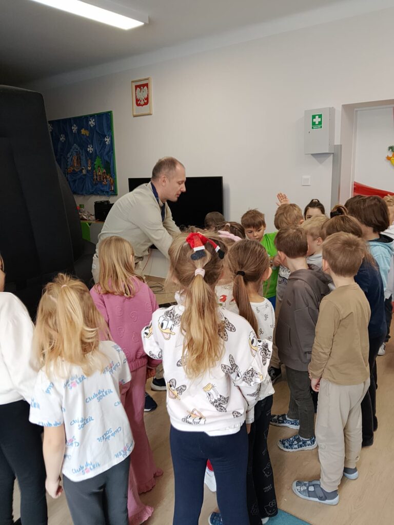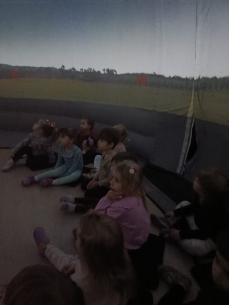 Dziś nasze przedszkole zamieniło się w prawdziwe centrum kosmicznych odkryć! Dzięki wizycie mobilnego planetarium dzieci mogły przenieść się w niezwykłą podróż po wszechświecie. Przedszkolaki poznały planety Układu Słonecznego, zobaczyły rozgwieżdżone niebo i dowiedziały się wielu ciekawostek o kosmosie . Projekcja wzbudziła ogromne emocje – było dużo zachwytu, pytań i radości z odkrywania tajemnic kosmosu. To była niesamowita lekcja nauki poprzez doświadczenie – pełna wrażeń i inspiracji do dalszego poznawania świata.